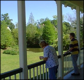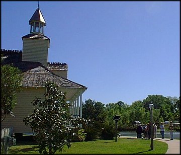 L'Eglise des Attakapas (boven), met bijbehorende Presbytère (rechtsonder) en uitzicht op de veerpont (linksonder).